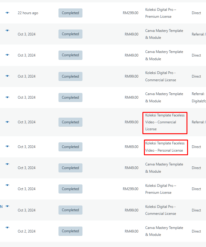 Ada, lihat order kat atas ni. Dia dah stuck buat sales produk, ending sukses buat sales pertama kali jual produk Digital